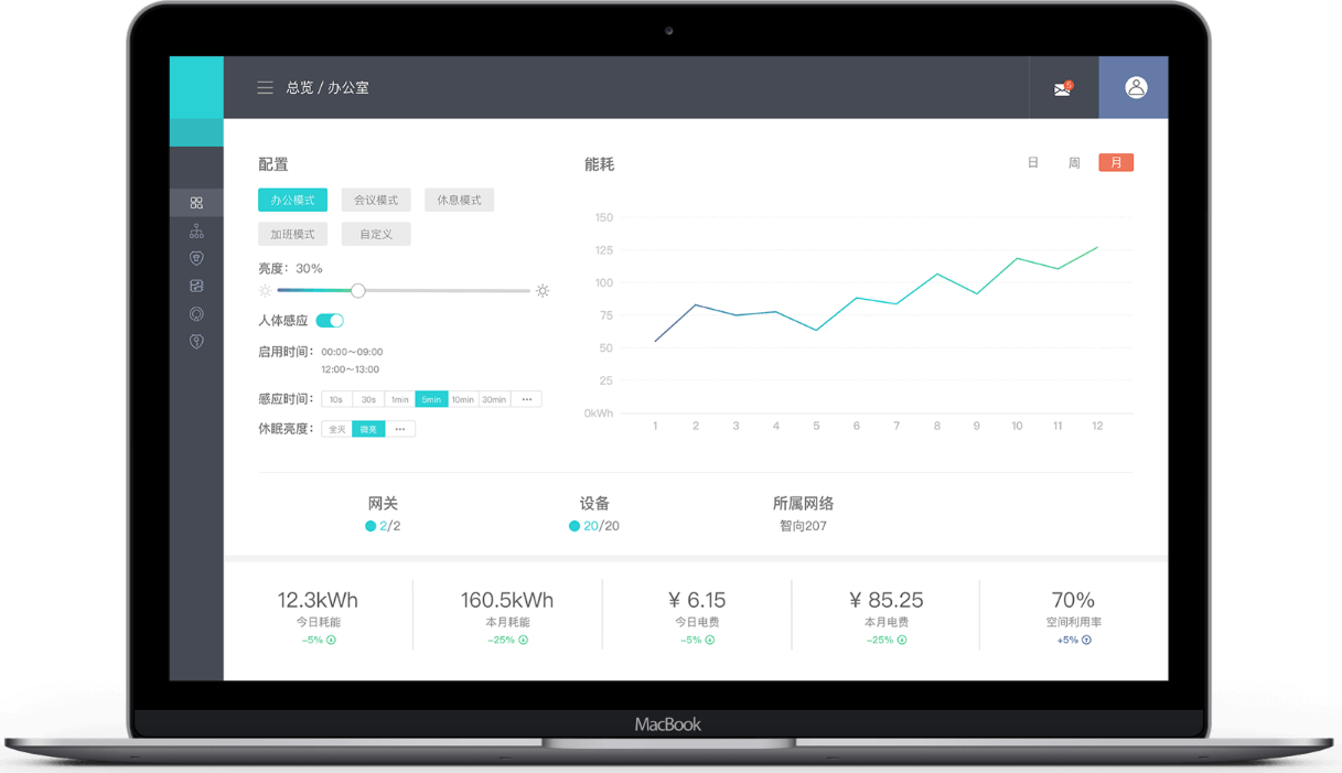 麦思物联智慧灯结合感光、任务调整、渐进调光和非工作时间等多种平台情景模式,智慧照明控制,可实现高达90 %的节能。 同时麦思物联平台与其他传感设备实时配合,依据实际需求自动调整空间温湿度等,合理能耗控制,节省成本。